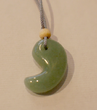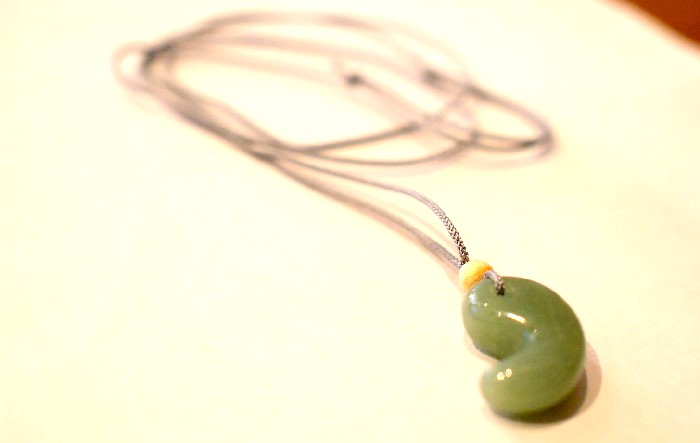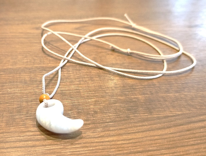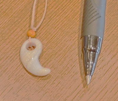小さなまがたまですが、この形はまがたまの中でも、古い形を表しています。 古墳時代によく作られていた形です。 「古代まがたま」と呼ばれています。